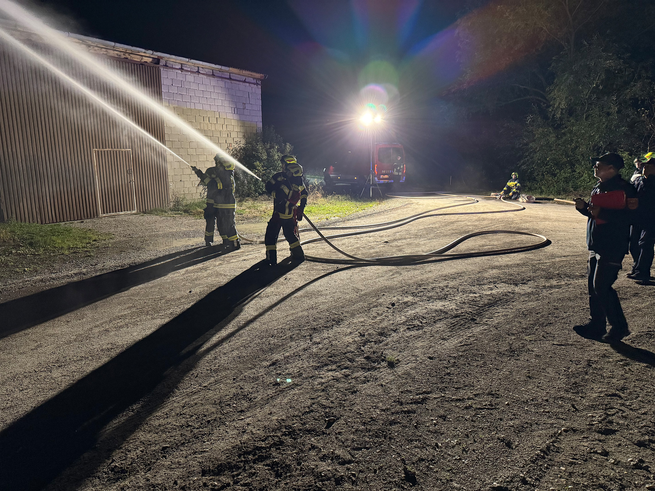 Die praktische Übung wurde möglichst realitätsnah angesetzt. Die Wasserentnahme erfolgte mittels Tragkraftspritze aus einem Bach; simuliert wurden ein Holzstapelbrand und ein Schuppenbrand.