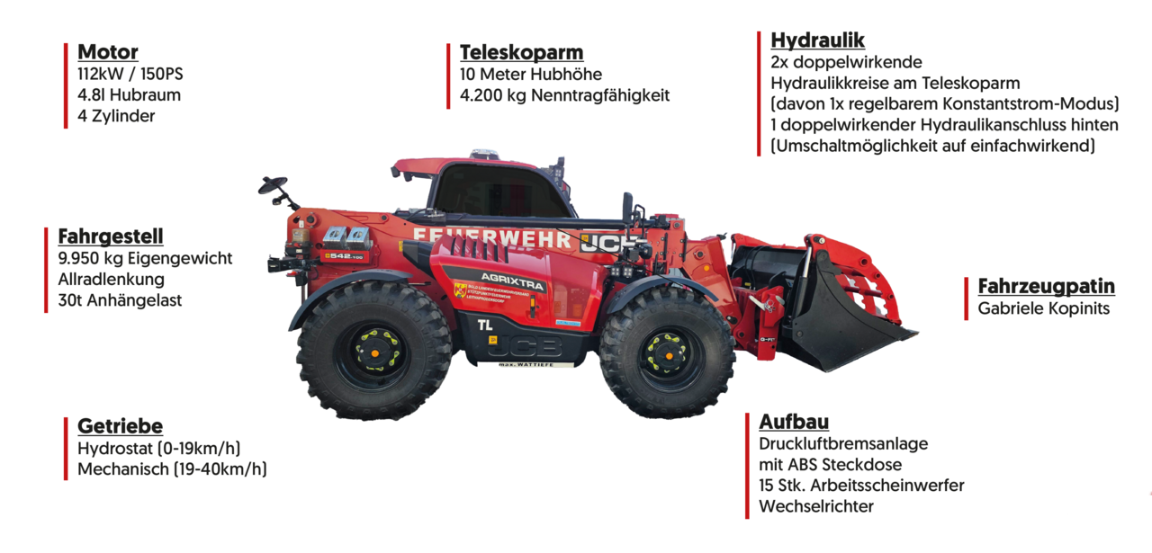 Der Teleskoplader des Typs JCB 542‑100 AGRI XTRA wird uns besonders bei Großschadenslagen, Unwettern, Sturmschäden und logistischen Aufgaben wertvolle Dienste leisten, in Leithaprodersdorf, im Bezirk und auf Anforderung im ganzen Burgenland.